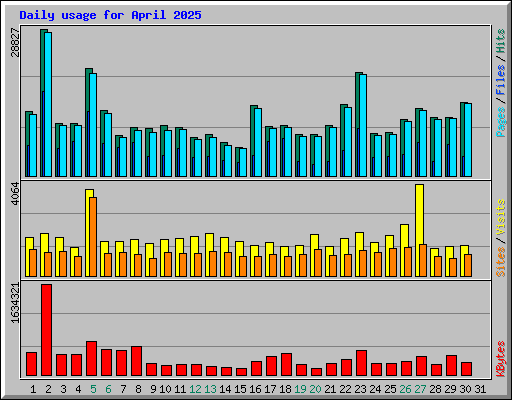 | Day | Hits | Files | Pages | Visits | Sites | KBytes | ||||||